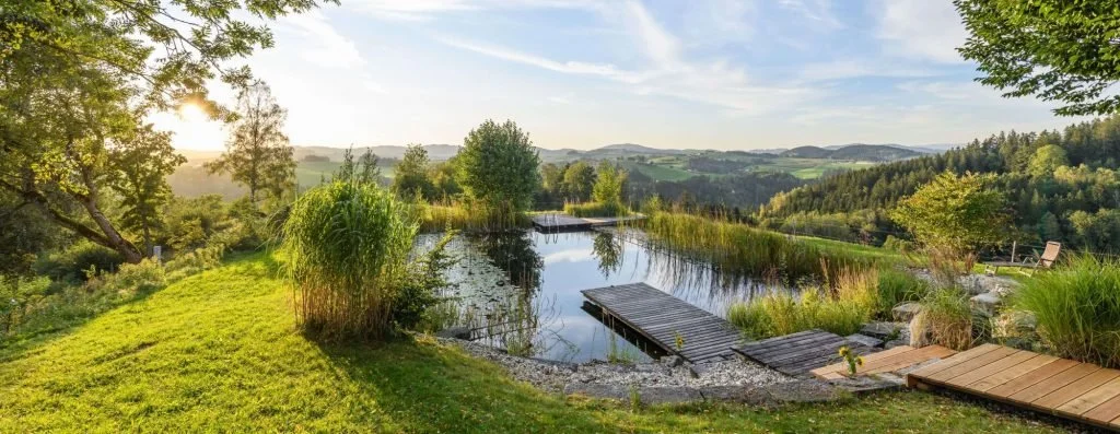 Zwischen den Lehr- und Lerneinheiten stehen uns ein Naturbadeteich und eine Zirbenholz-Sauna zur Verfügung, sowie zahlreiche Spazierwege, die vom Hof ausgehen.